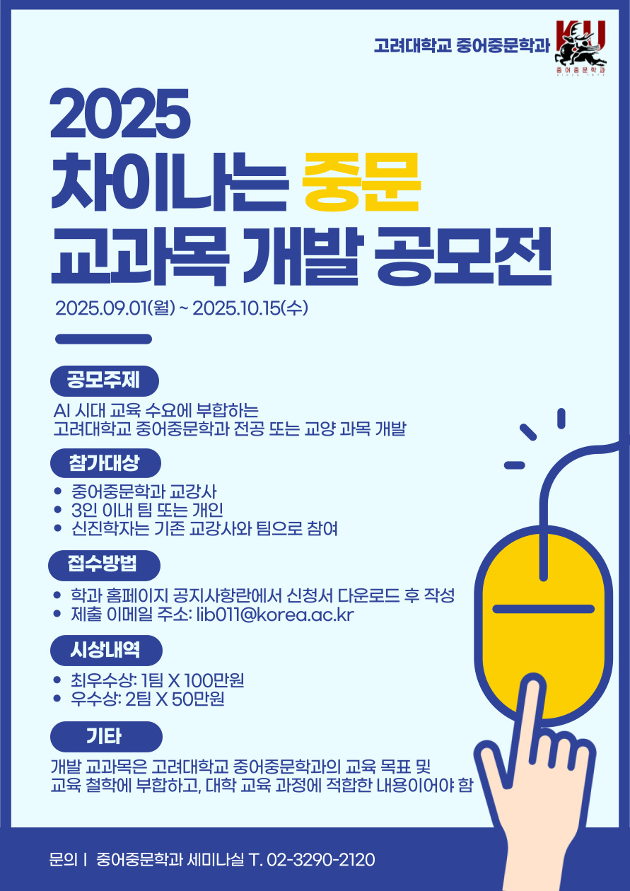 중문과에서는 2025학년도 교육 혁신을 위한 '차이나는 중문' 교과목 개발 지원 사업을 공모합니다. 창의적이고 도전적인 교과목 개발을 통해 우리 학과 교육 경쟁력을 강화하고자 하오니, 관심 있는 분들의 많은 참여를 바랍니다.